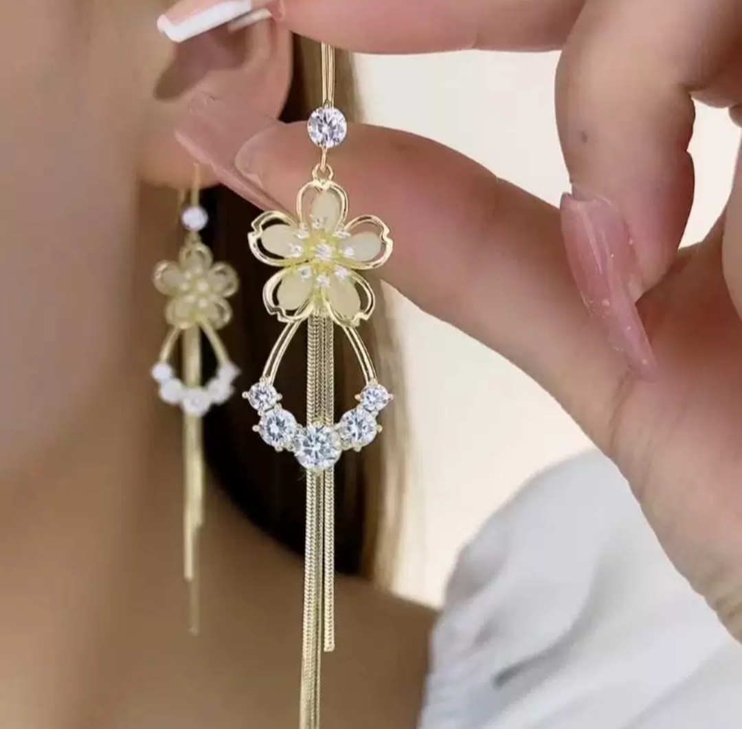 Aretes largos de flores, con gemas en color oro